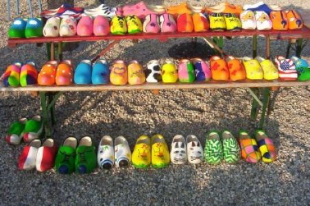 Klompen schilderen is een leuke, creatieve workshop voor jong en oud. U zit aan een lange tafel met Keulse potten gevuld met penselen, kwasten, sponsjes, verflappen, water en potjes acryl verf.