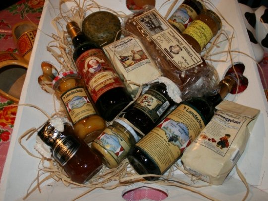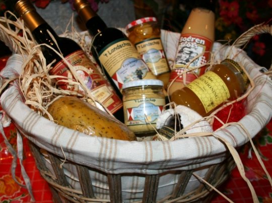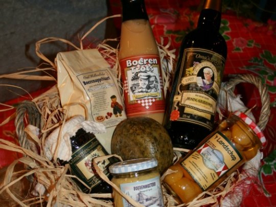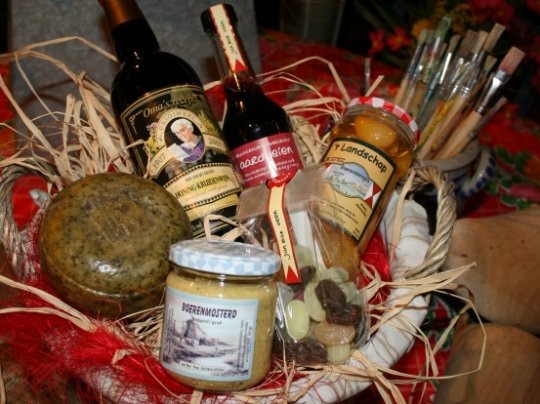 Een mooie rietenmand gevoerd met katoen en gevuld met heerlijke landproducten: een fles heerlijke honingkruidenwijn, aardbeiensiroop, boerenmeisjes, boerenmosterd, klein boerenkruidenkaasje, Oud Hollands snoepgoed.